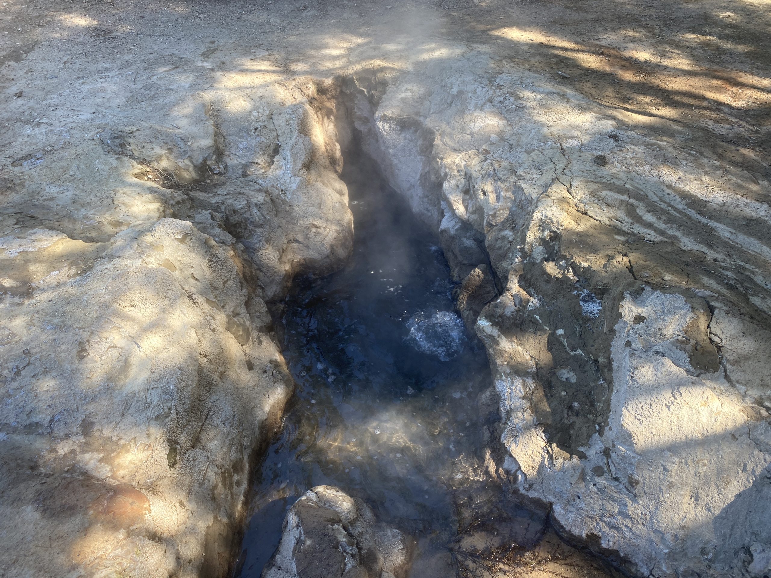 This was a thin jet of fizzy water that quickly reached an estimated six to seven meters above the vent. The jetting stayed strong for about a minute, then started to subside. By about two minutes, the jetting paused, then restarted. This activity continued for another 4-1/2 minutes, with the pauses getting longer and the heights of the jets decreasing. By the end, the height was maybe ten centimeters lasting a couple of seconds. Then all was quiet again.
